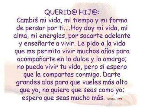 Querido hijo, no tengo suficientes palabras para expresar lo mucho que te amo. Eres una parte fundamental de mi vida y no puedo imaginar mi futuro sin ti. Siempre estaré aquí para apoyarte en todo lo que necesites y para celebrar tus triunfos contigo. Eres mi hijo y siempre te amaré incondicionalmente.